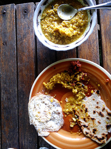 Rotti, Margarine, Lunu miris and Dhal for breakfast. Mmmmm. Tasty. After breakfast we went out to have a look around. Surrounding is really beautiful and attractive. Clouds kissing peak of the mountains, Greenish environment, No houses, No people everything give a great natural experience. We were amazed by that environment. Oh my god. There are three leaches on my leg. I hate leaches. Thank god, my husband doesn’t hate them.